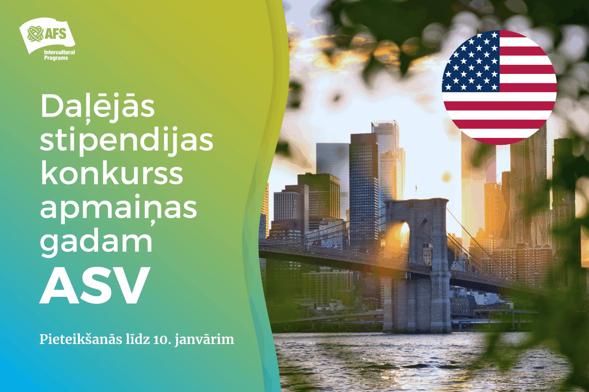 1. “AFS Latvija” (turpmāk – AFS) sadarbībā ar AFS partnervalstīm Latvijas  vidusskolniekiem piedāvā daļējo stipendiju gada mācību programmai ASV.  Kopējā programmas dalības maksa ir 10900 EUR. Stipendijas apmērs ir  2000 EUR, kas paredz, ka kandidātam ir jāsedz atlikusī programmas dalības  maksa 8900 EUR apmērā (dalības maksa tiek veikta ikmēneša  maksājumos, bet kopējai dalības maksai jābūt nomaksātai līdz jūlija  vidum).